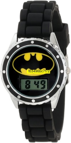 Round silver-tone watch with Batman logo on dial and rubber link band Quartz movement with digital display Protective glass crystal dial window Features buckle closure Not water resistant